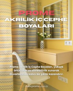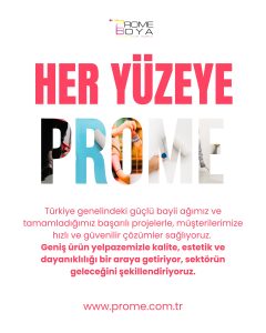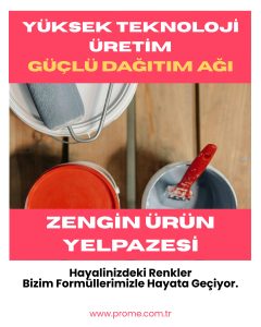 Prome Boya, her yüzeyde yüksek kaliteli, dayanıklı ve estetik boya çözümleri sunan geniş bir ürün yelpazesine sahiptir. Epoksi, akrilik, poliüretan, yağlı boya ve vernik gibi seçeneklerle hem iç hem de dış mekanlar için ideal çözümler sağlıyoruz.
